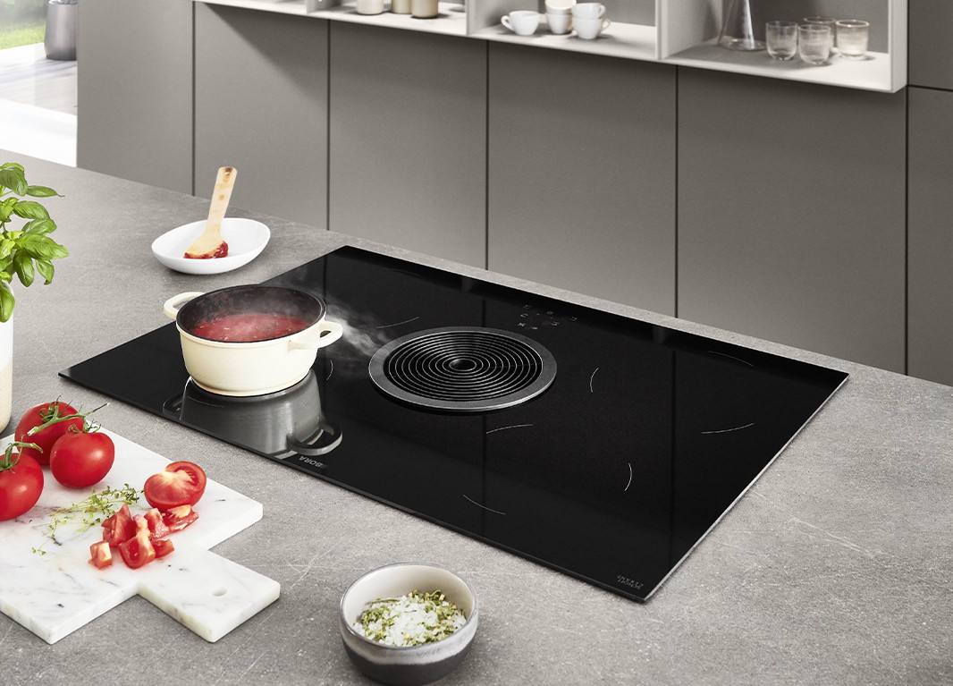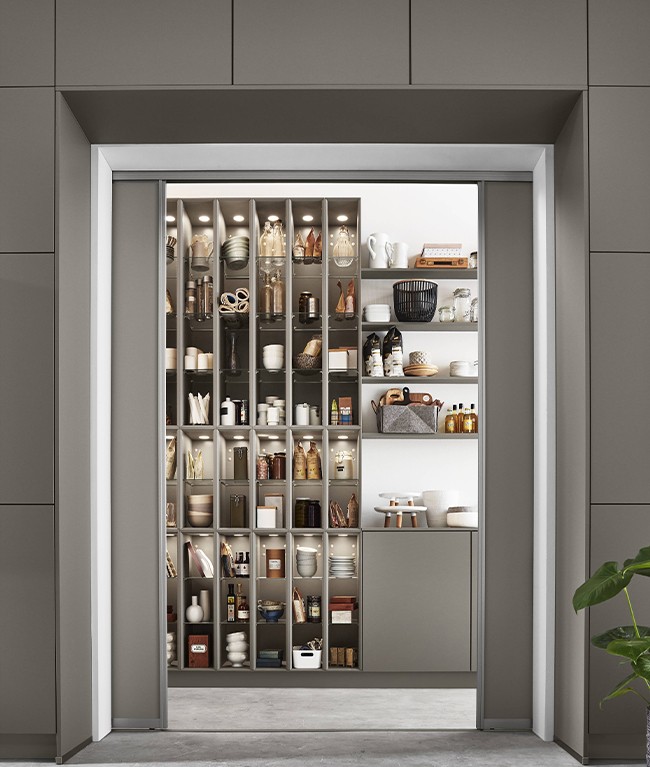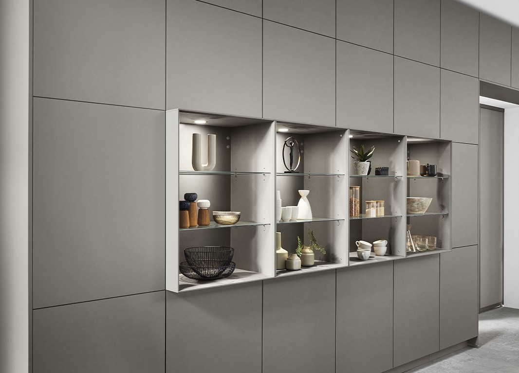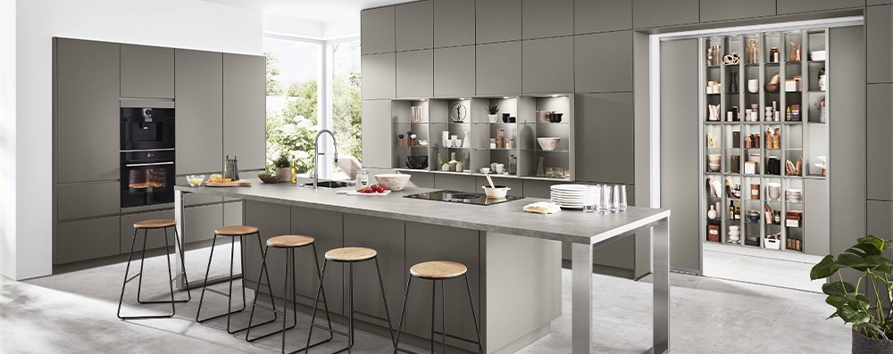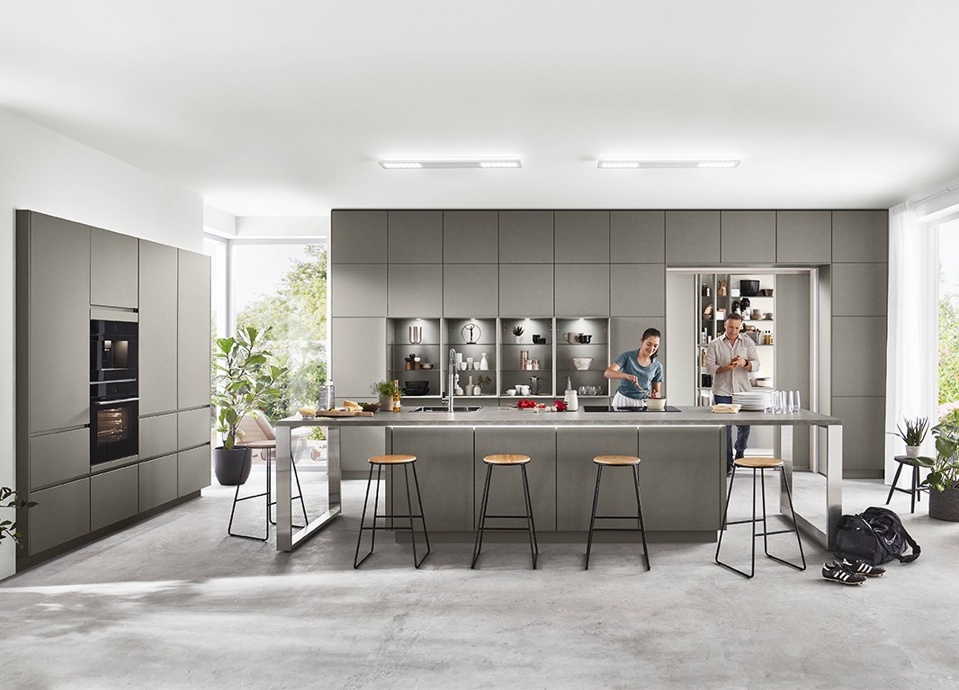 Cette cuisine blanc alpin recouverte d’un revêtement anti-traces de doigts respire la fraîcheur, la convivialité et la générosité grâce à ses façades de hauteur Maxi. Un splendide complément : l’élément haut en verre Flat en version extra-haute séduit par ses splendides vitrines.