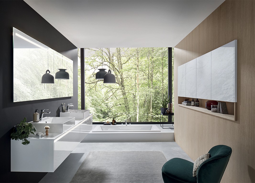 Avec des surfaces brillantes, vous obtenez un look de salle de bains haut de gamme tout en bénéficiant d’un agrandissement optique de la pièce.