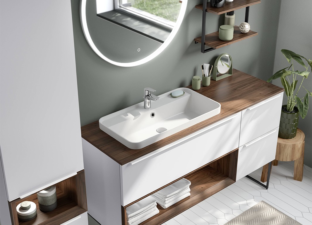 Trois points forts pour créer votre style préféré, épuré et esthétique : grâce aux nouvelles façades de finition, l’élégante ligne d’éléments bas réserve bien des surprises. Le miroir éclairé peut être contrôlé à l’aide d’un capteur tactile. L’élément haut étagères peut être combinée et positionnée librement.
