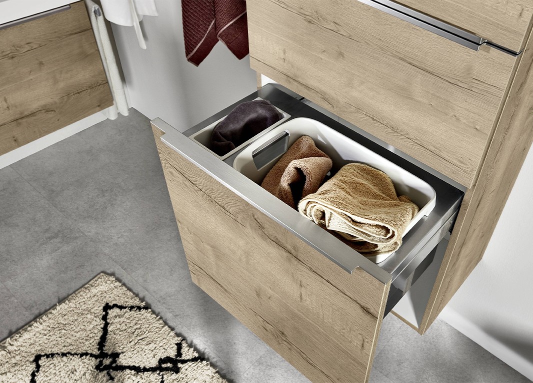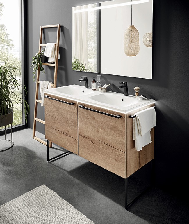 Profitez d’une ambiance chaleureuse et confortable avec tous vos sens. Un look typique : les nuances de gris et les aspects naturels du bois se marient parfaitement et confèrent à l’aménagement de votre salle de bains une touche personnelle.